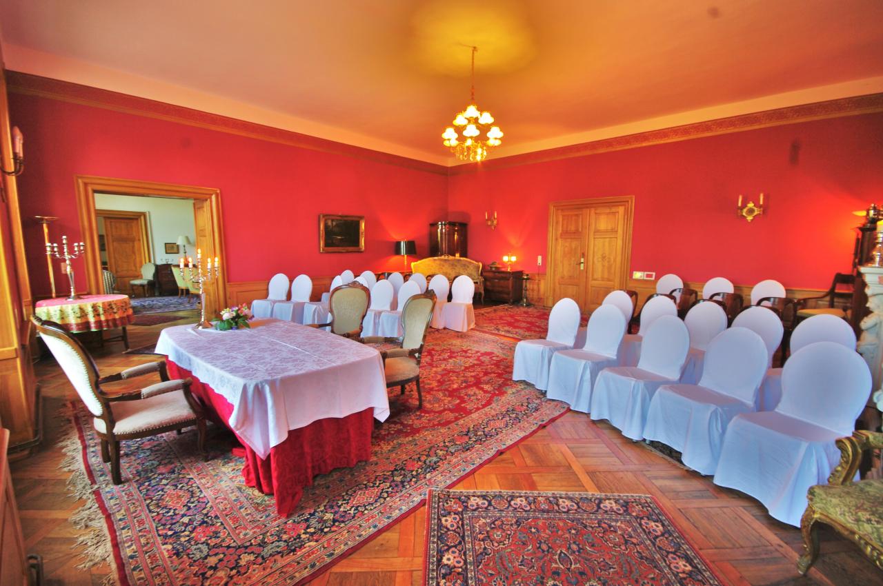 Diverse Festräumlichkeiten von 20 bis 130 Personen (nach Absprache auch mehr) laden Sie ein: Roter Salon, Grüner Salon, Grafensalon, Bassensaal, Gewölbekeller und Park.